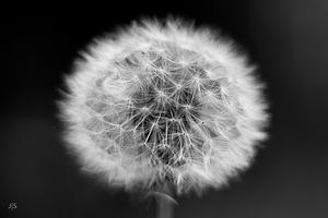 Close up photo of a dandelion seed head in black and white